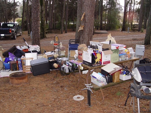 Moving out. Thank goodness Southlake Campground wasn't crowded. We had to spread our personal belongings out all over the neighboring spot. You may be wondering how we fit all of this junk into a 37 foot box? Let's just say you have to get creative....